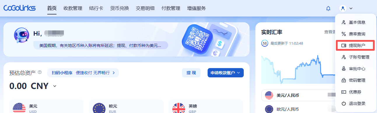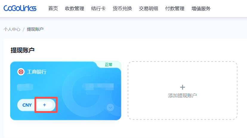 支持在同一张卡上绑定多个币种,操作路径【提现账户】找到对应结算账户点击【+】添加新币种