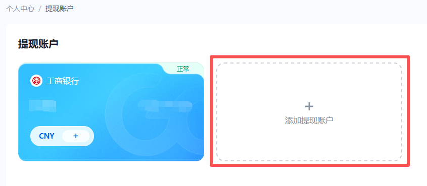 1. 后台首页右上角个人中心点击【提现账户】,进入点击【添加提现账户】