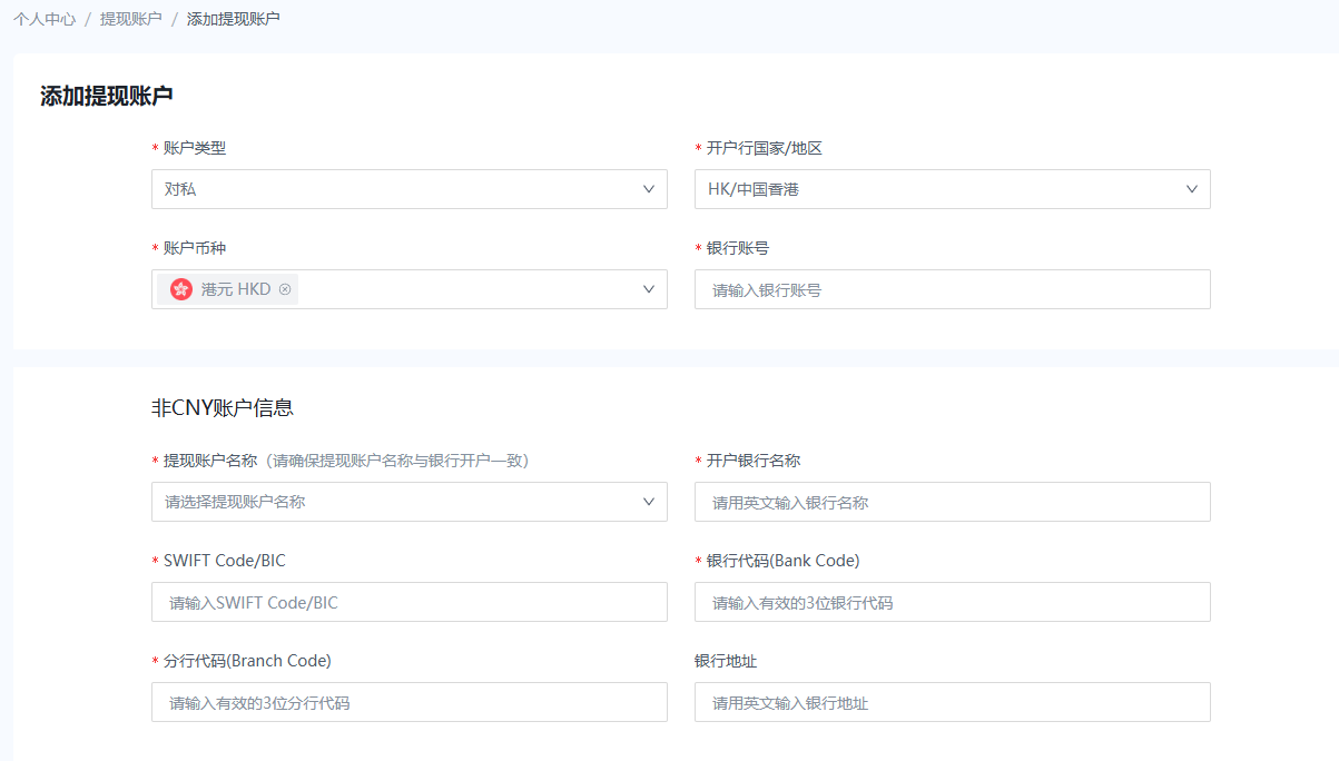 一、支持添加对公、董事或受益人的银行账户作为提现/结算账户