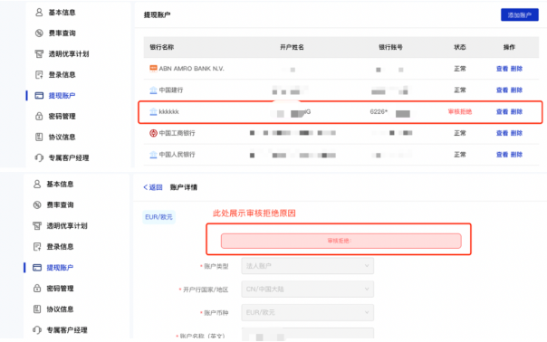 客户端-个人中心-结算账户菜单中,点击被审核拒绝的这张结算卡,点击【查看】,就会看到具体的拒绝原因