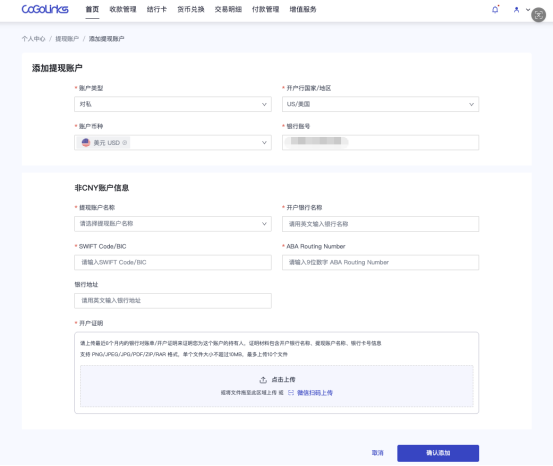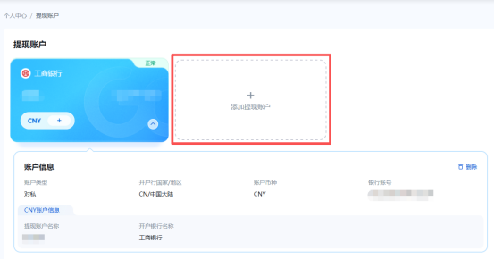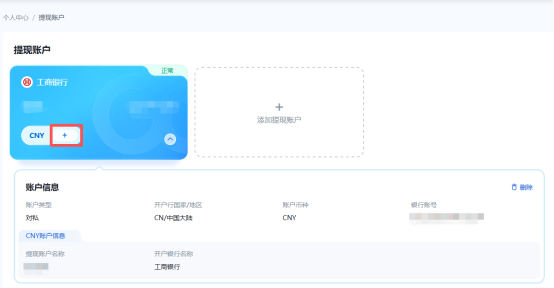如您当前已添加过的银行支持外币账户提现,您可以点击+号进行添加新币种。如您已添加的账户不支持收外币,可参考第①步进行操作添加外币账户。