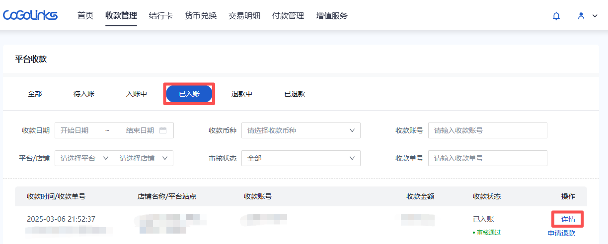 11. 点击【收款管理-平台收款】找到入账的两笔Paypal款项,然后在PayPal内输入对应的两笔金额数字,验证成功即可完成绑定。