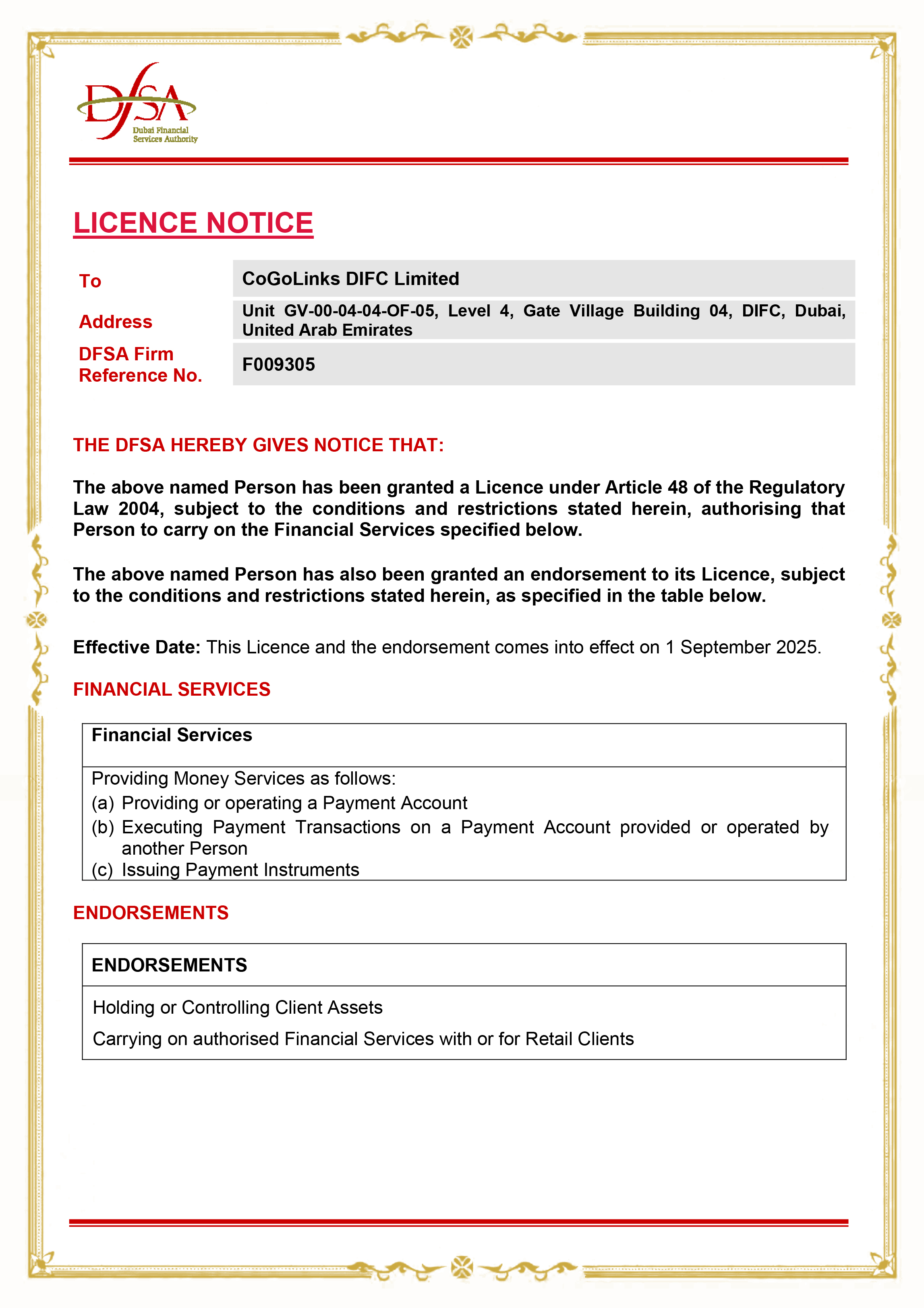 结小行骄傲宣布:CoGoLinks结行国际海外主体正式在迪拜国际金融中心(DIFC)获得由迪拜金融服务管理局(DFSA)批准的金融服务许可,这意味着CoGoLinks结行国际的综合能力得到了中东地区监管机构认可,可以为布局阿联酋的企业以及阿联酋本土商家提供更加合规、安全、高效的跨境支付服务啦!